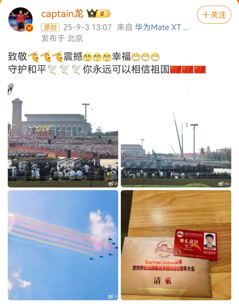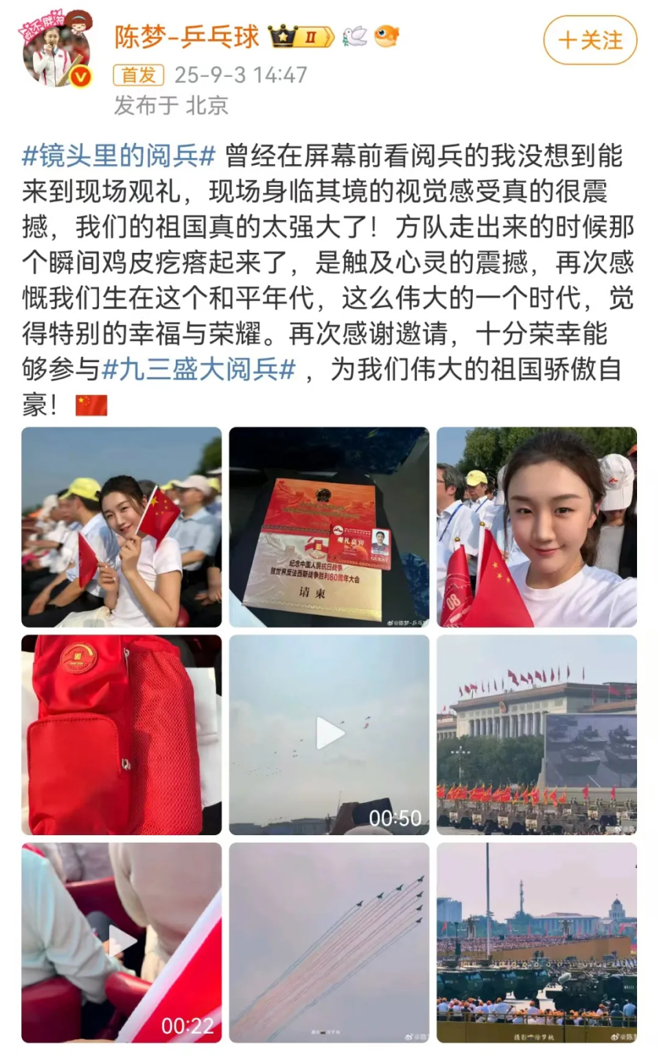 汪顺、马龙、陈梦等运动员在社交平台上分享了观看阅兵的心情。